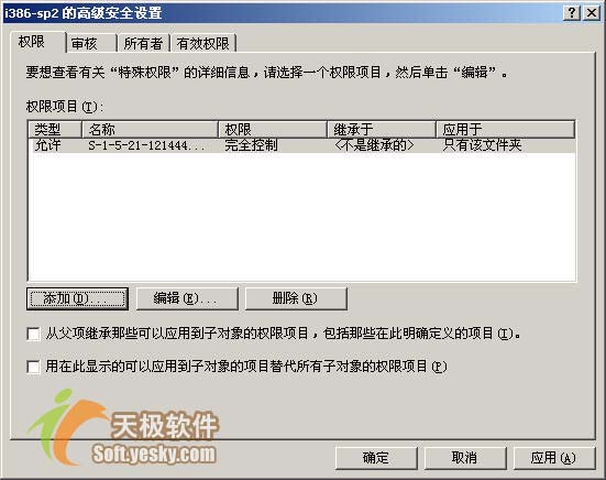 图2 安全选项卡 3、单击图2所示对话框中的“高级”按钮,弹出“i386-sp2的高级安全设置”对话框,显示目前该项目的所有者为刚才看到的未知帐户。选择“将所有者更改为”下方的用户,比如笔者现在使用的用户名称,然后单击“应用”按钮,所有者就改变为现在用户了,如图3所示。