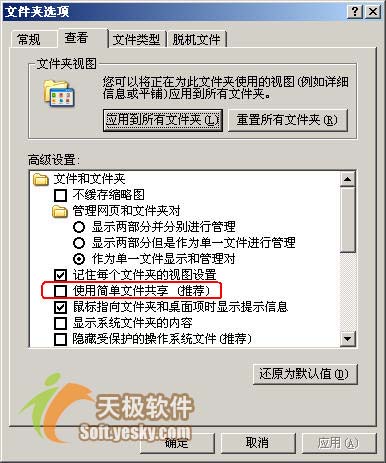 图1 取消“使用简单共享” 2、右键单击原来设为专用的文件夹,如“i386-sp2”,从弹出菜单中选择“属性”,这时会看到在对话框中多出一个“安全”选项卡。可以看到这里有一个未知帐户,这应该就是原来XP系统中的那个帐户吧。这个帐户是能够访问该文件夹的,可问题是我们现在已经不能使用这个帐户。所以要另想办法。